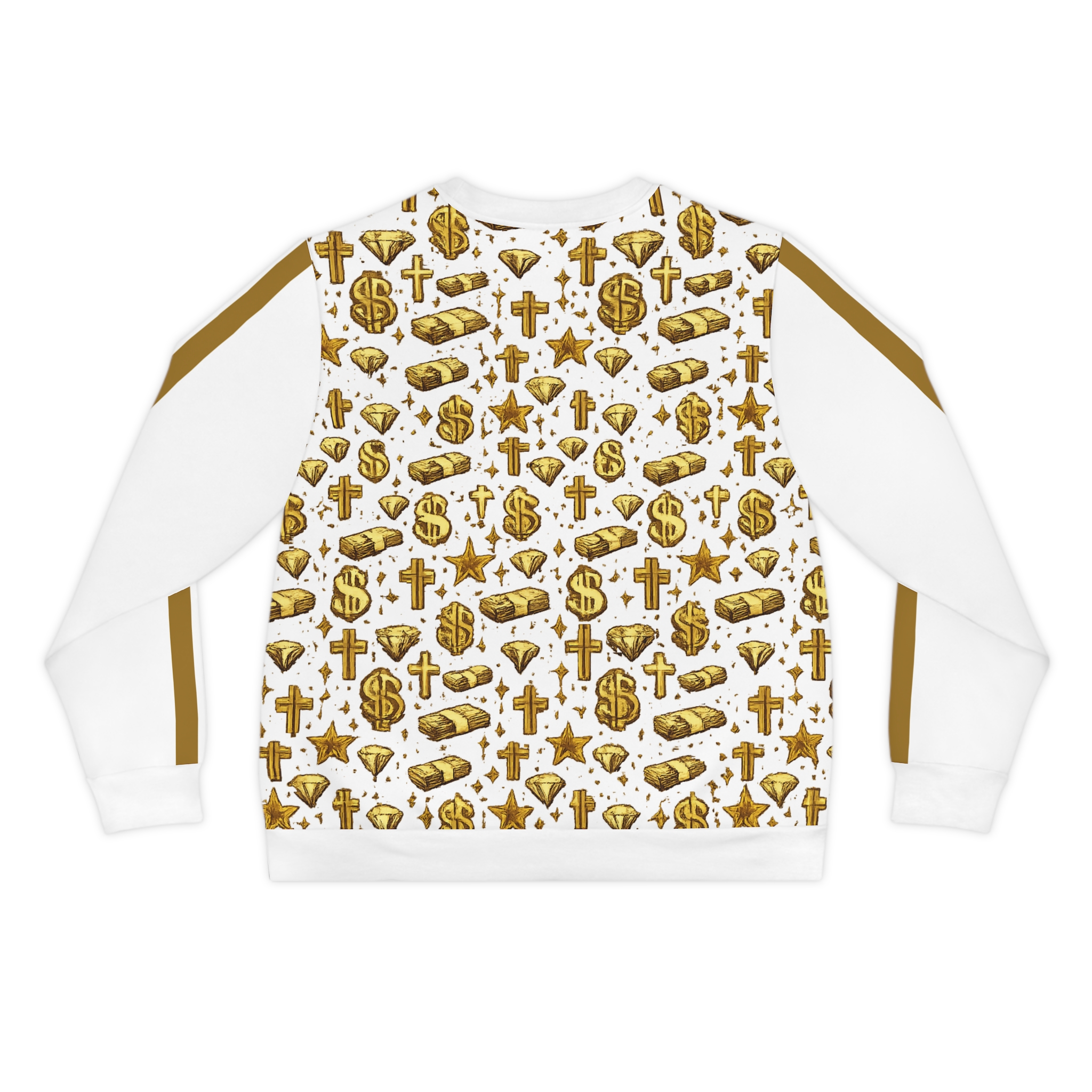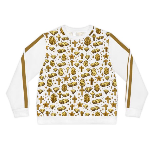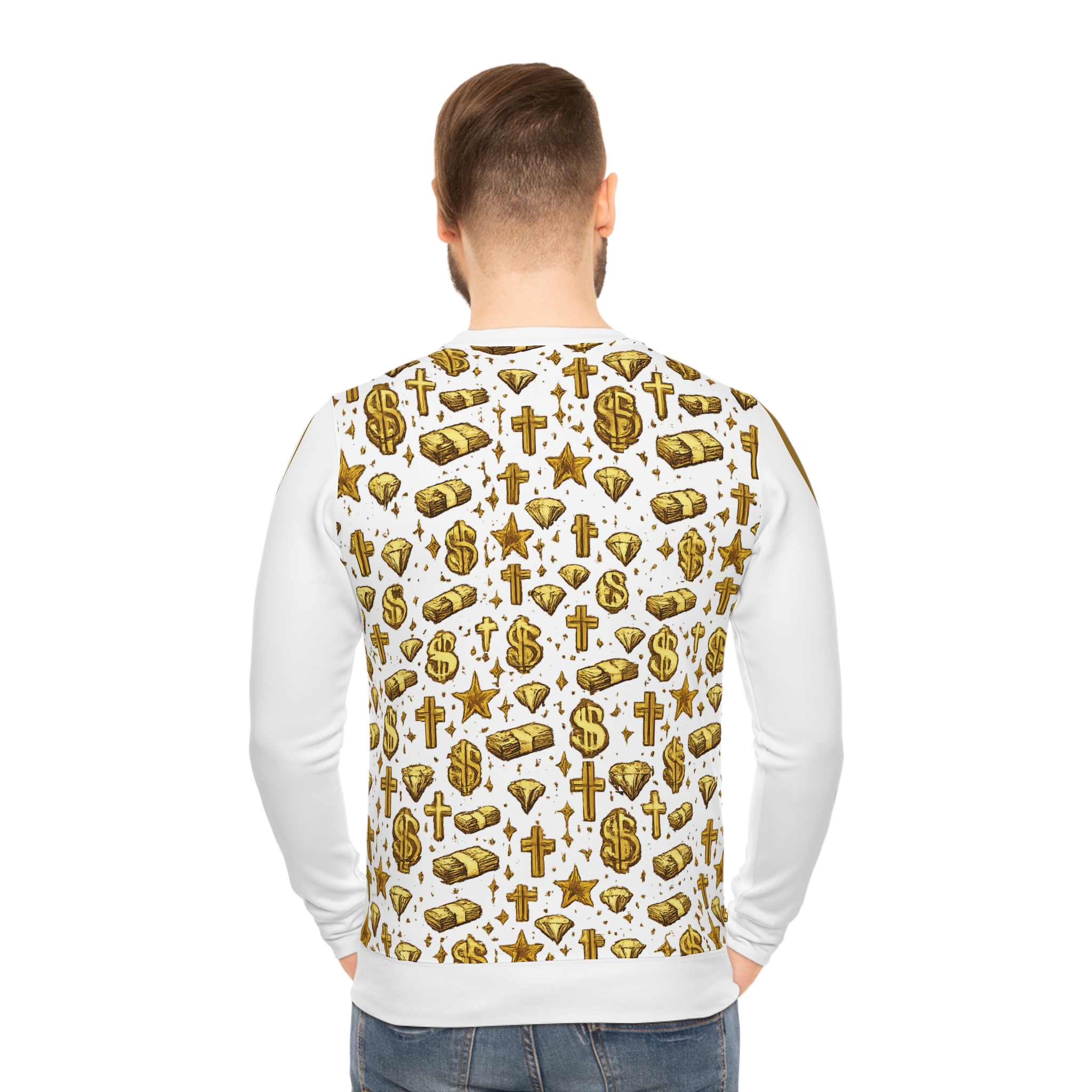 Be the first to review “Gold Wealth Pattern Star Status Sweatshirt — All-Over Print Lightweight Crew”
