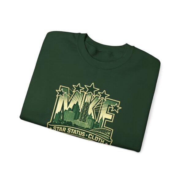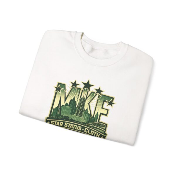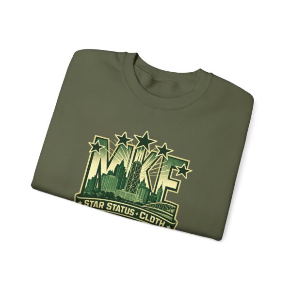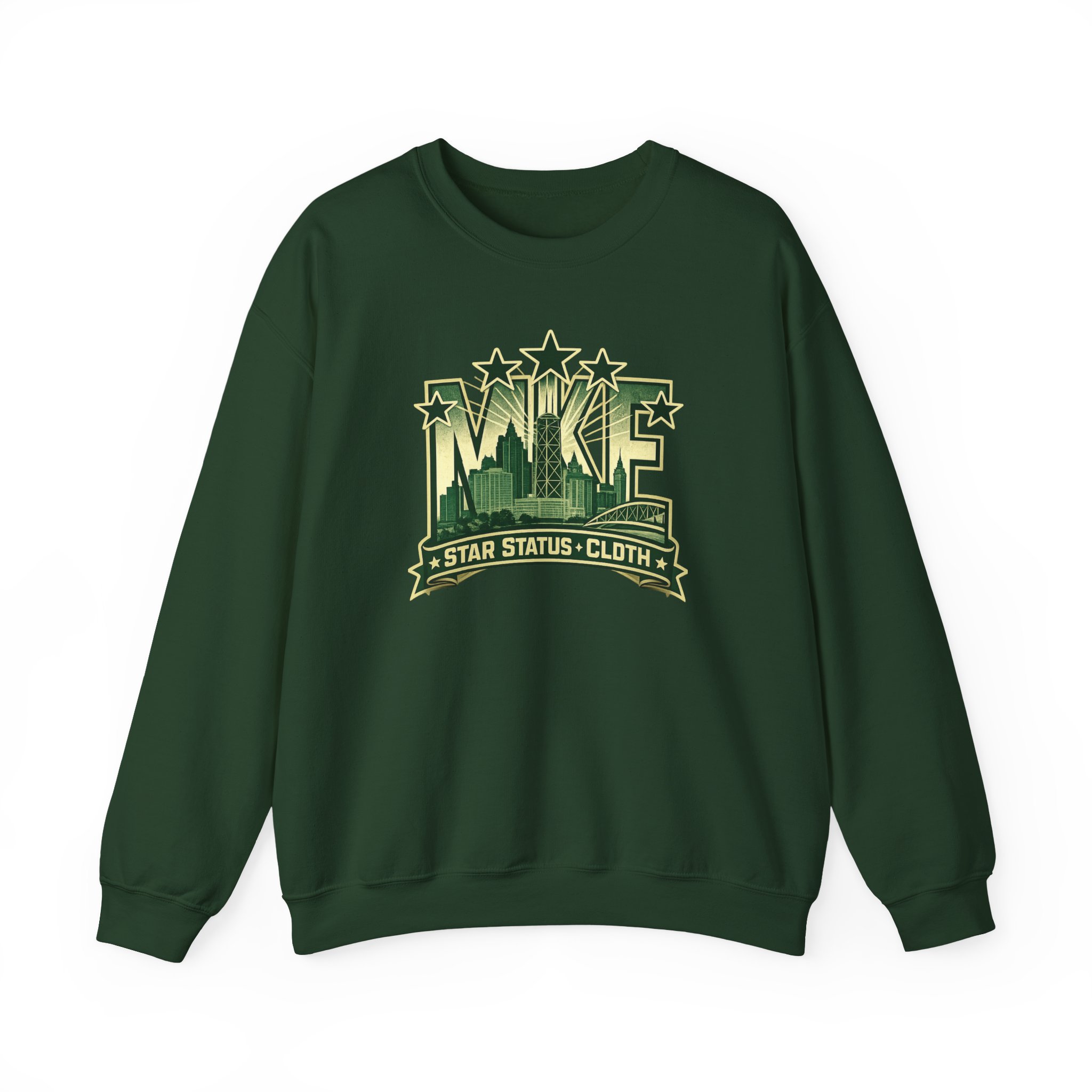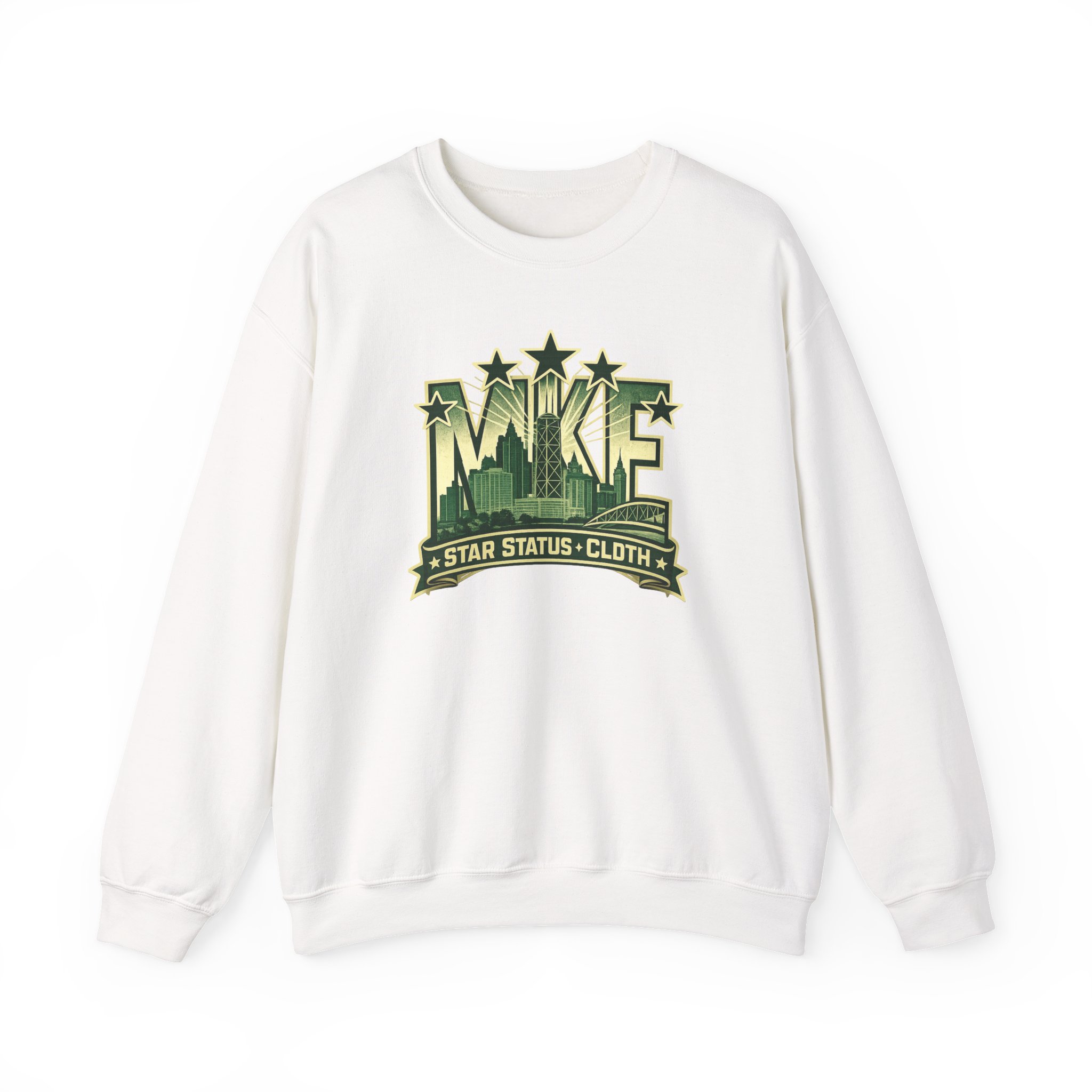 A soft, midweight crewneck sweatshirt with a vintage-inspired cityscape emblem embroidered and printed across the chest. The muted green graphic reads like a reclaimed sports crest—faded stars, skyline silhouettes, and a bannered tagline—giving the sweater a lived-in, streetwise character. Cut in a classic crew fit from a 50/50 cotton-poly blend, it holds shape with ribbed collar and double-needle stitching while feeling warm without bulk. Small details—tear-away label, tubular knit body for clean lines, and optional embroidery placement on chest or wrists—make it feel thoughtfully made. Wear it layered over a tee for slow mornings in the neighborhood, or toss it on after a late studio session; it blends into everyday routines while quietly standing out.