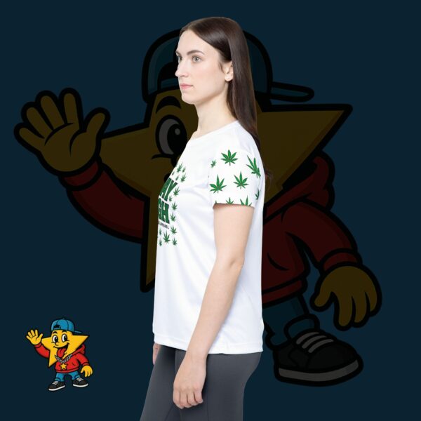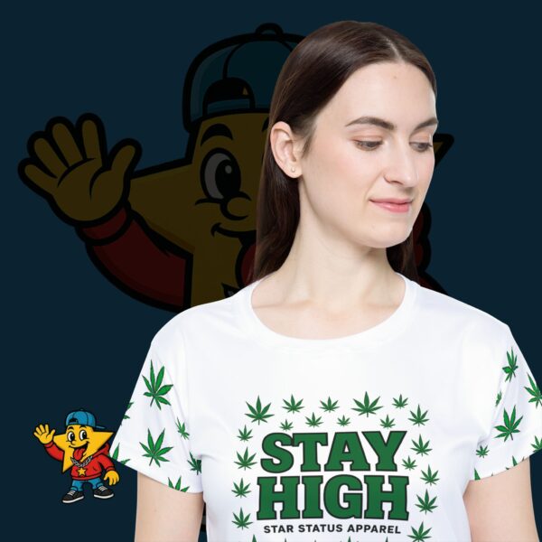 Lightweight, breathable sports jersey with full-color all-over print that channels laid-back smoke-session vibes. The front features a bold “STAY HIGH” emblem framed by a grid of cannabis leaves, with matching leaf accents down the sleeves. Cut for a classic, easy fit with 1×1 ribbed collar and armholes that stretch on and return to shape, this tee moves with you during runs, skate sessions, or relaxed hangouts. Moisture-wicking polyester keeps you cool and dry; colors stay bright thanks to modern printing. Wear it for long winter days, chill nights with friends, or whenever you want clothing that speaks your language without being shouty.